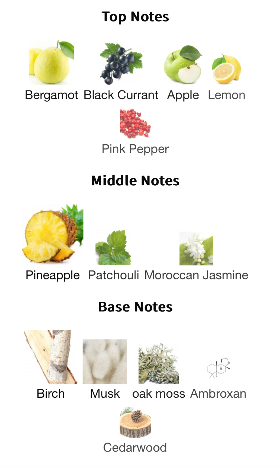 Base: Birch, Ambroxan, Cedarwood, Oakmoss, Musk
