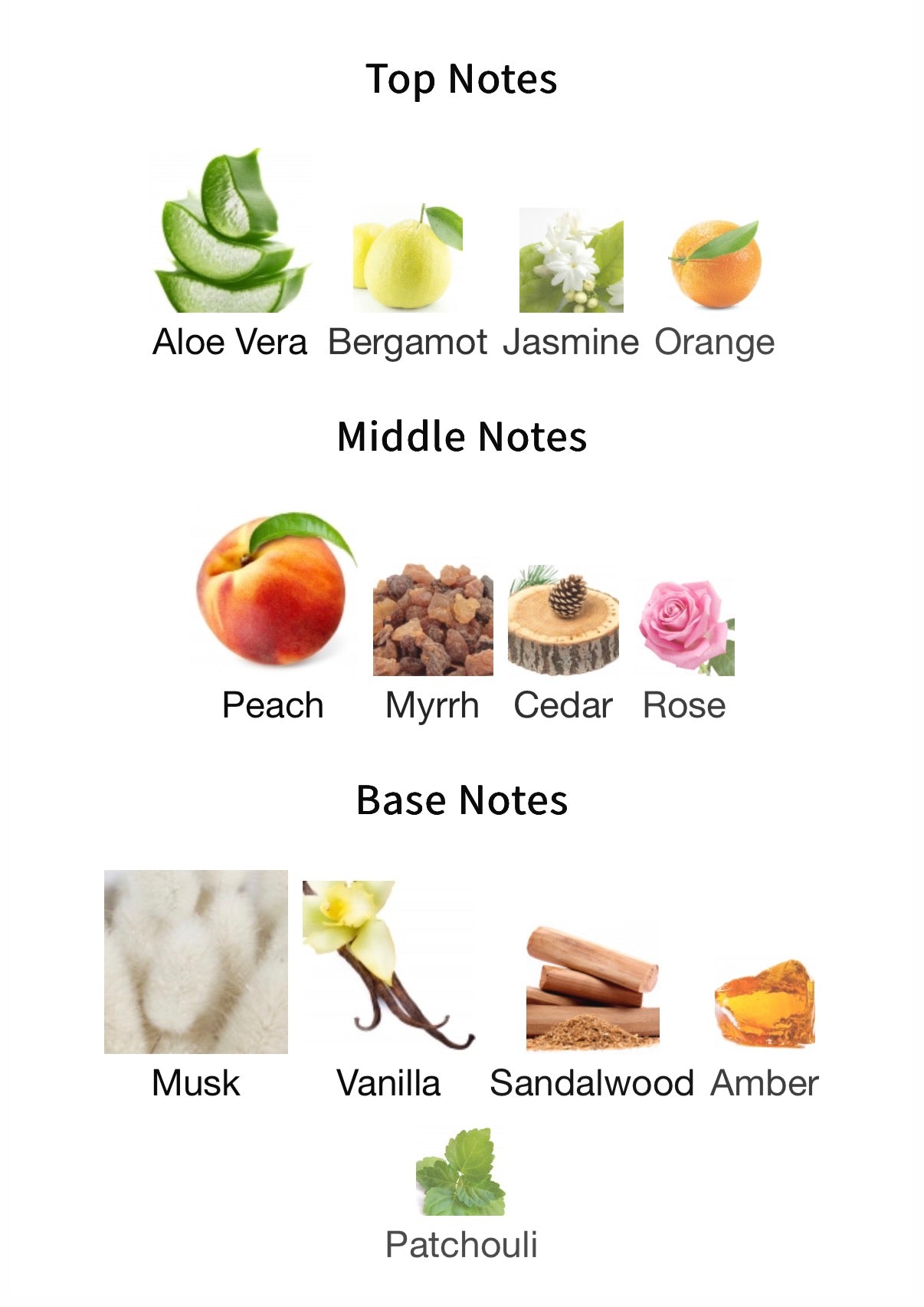 Base: Musk, Vanilla, Sandalwood, Amber, Patchouli