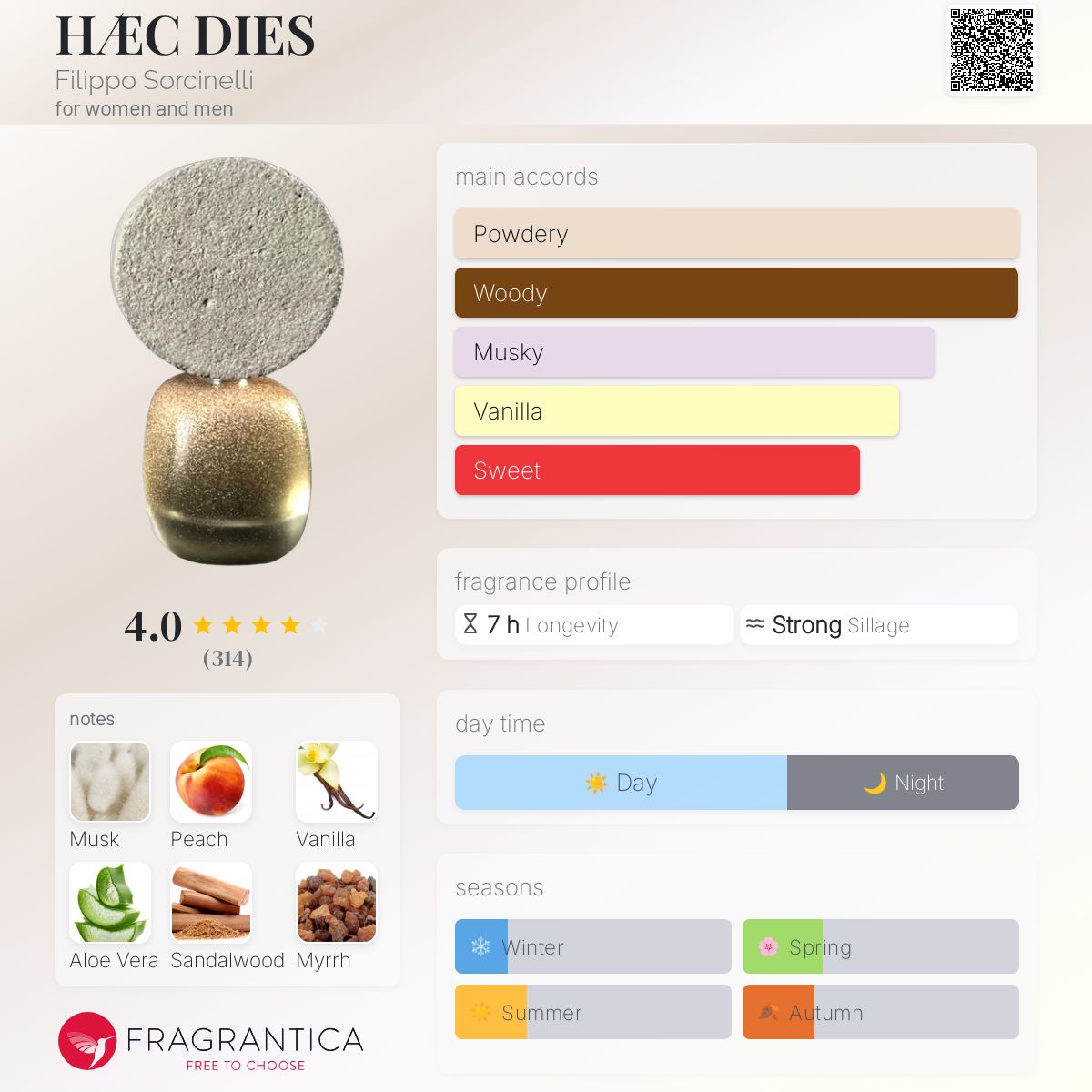 Filippo Sorcinelli HÆC DIES (not “have Dias”) is an extrait de parfum that belongs to the Delire de Voyage collection, inspired by the emotional and spiritual moments surrounding Easter, particularly the story of the women discovering the rolled-away stone from Jesus’ tomb in Mark’s Gospel. The scent is an olfactory evocation of the aromatic oils—aloe and myrrh—once used for anointing, set against the backdrop of stained white linen, sandy skin, and the transformative wonder of resurrection.