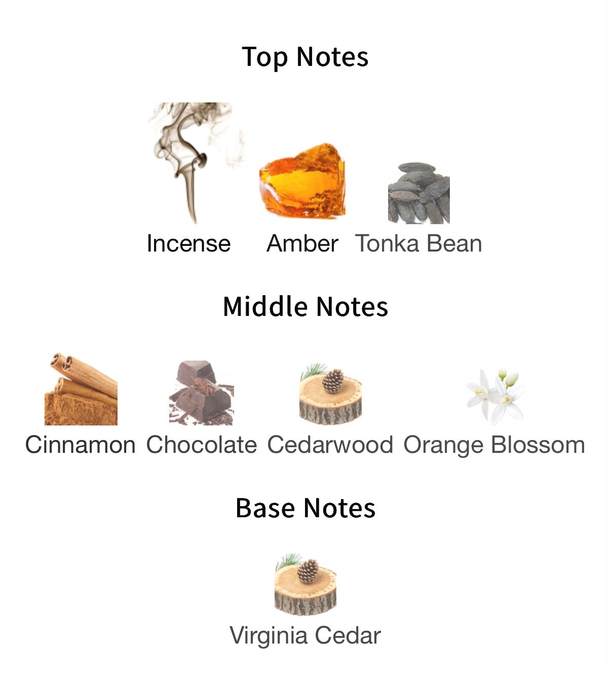 Middle: Chocolate, Orange Blossom, Cedarwood, Cinnamon