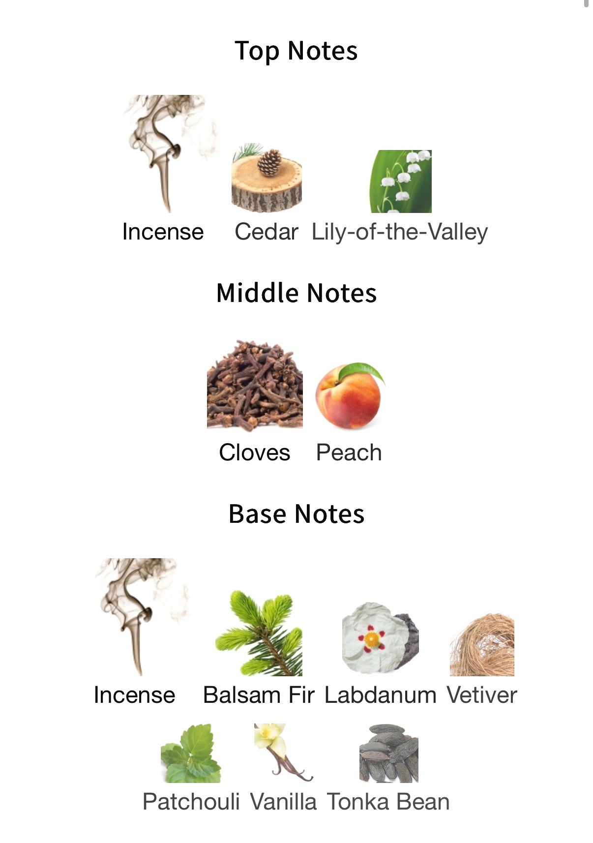 Base: Incense, Balsam Fir, Labdanum, Patchouli, Vetiver, Tonka Bean, Vanilla.