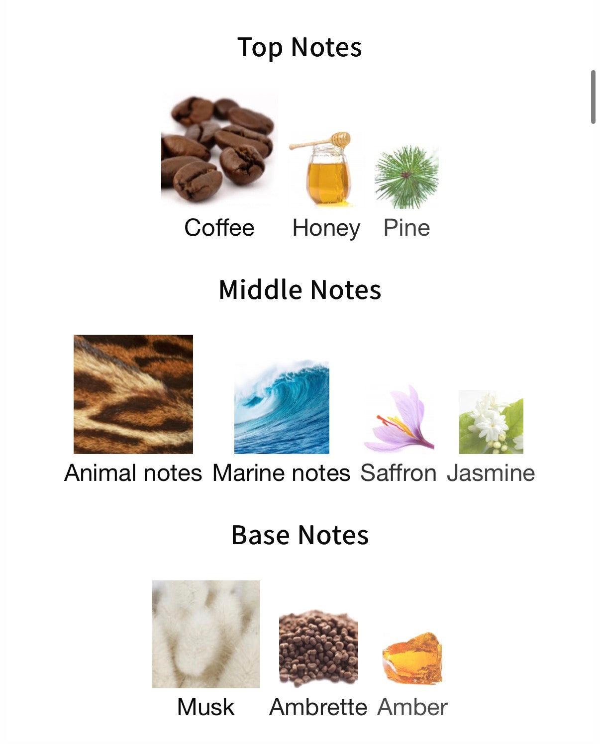 Heart: Saffron, Animal notes, Jasmine, Marine notes
