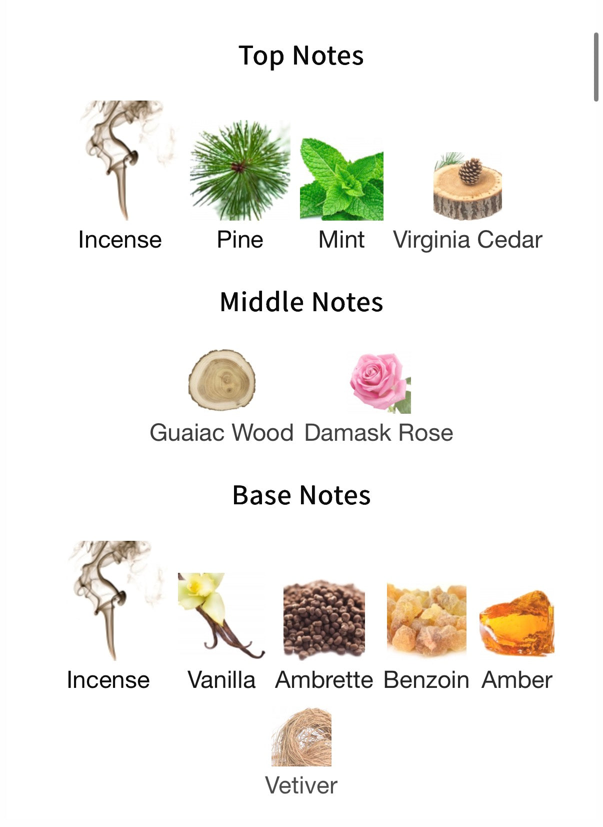 Top: Ambrette, Bergamot, Geranium, Mint, Pine Essence, Incense