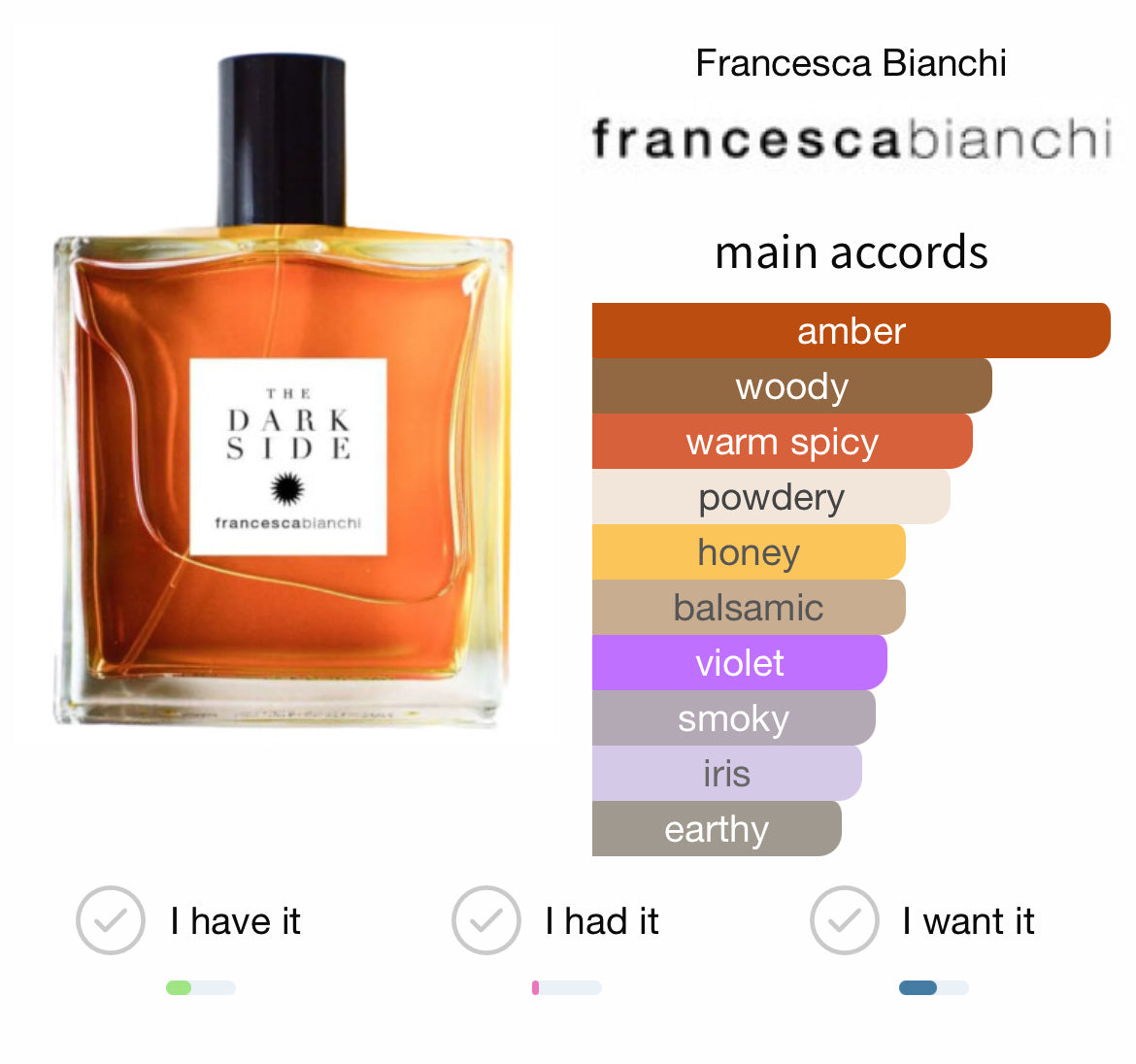 The warm, spicy and smoky fragrance of The Dark Side is an intriguing perfume for women and men from the house of Francesca Bianchi. Launched in 2016, this titillating scent features notes from honey, styrax, incense, iris, spicy notes, amber, violet, vanilla, patchouli, cedar, vetiver and sandalwood.