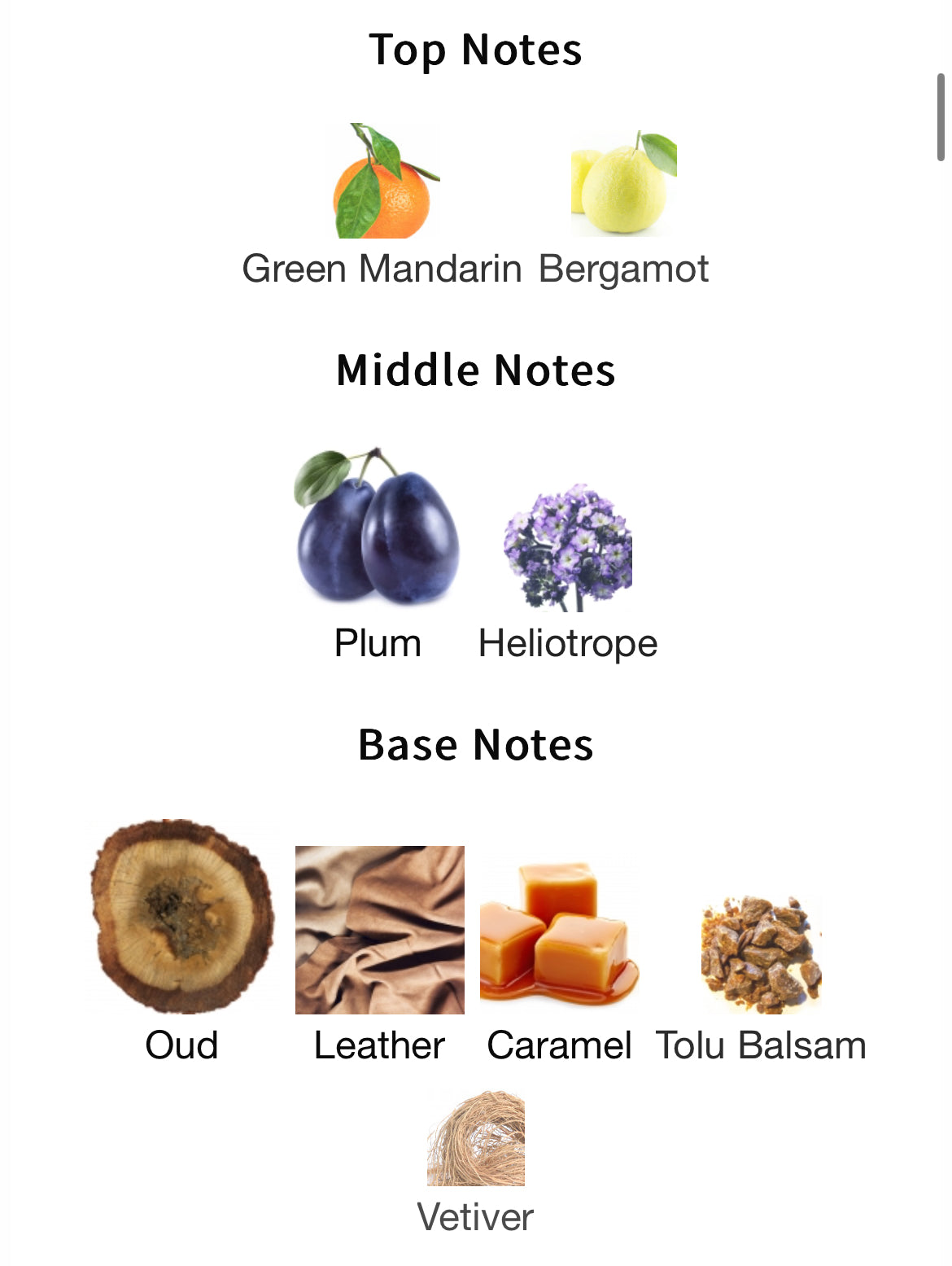 Base: Oud (Cambodia), Leather, Vetiver, Tolu Balsam, Caramel