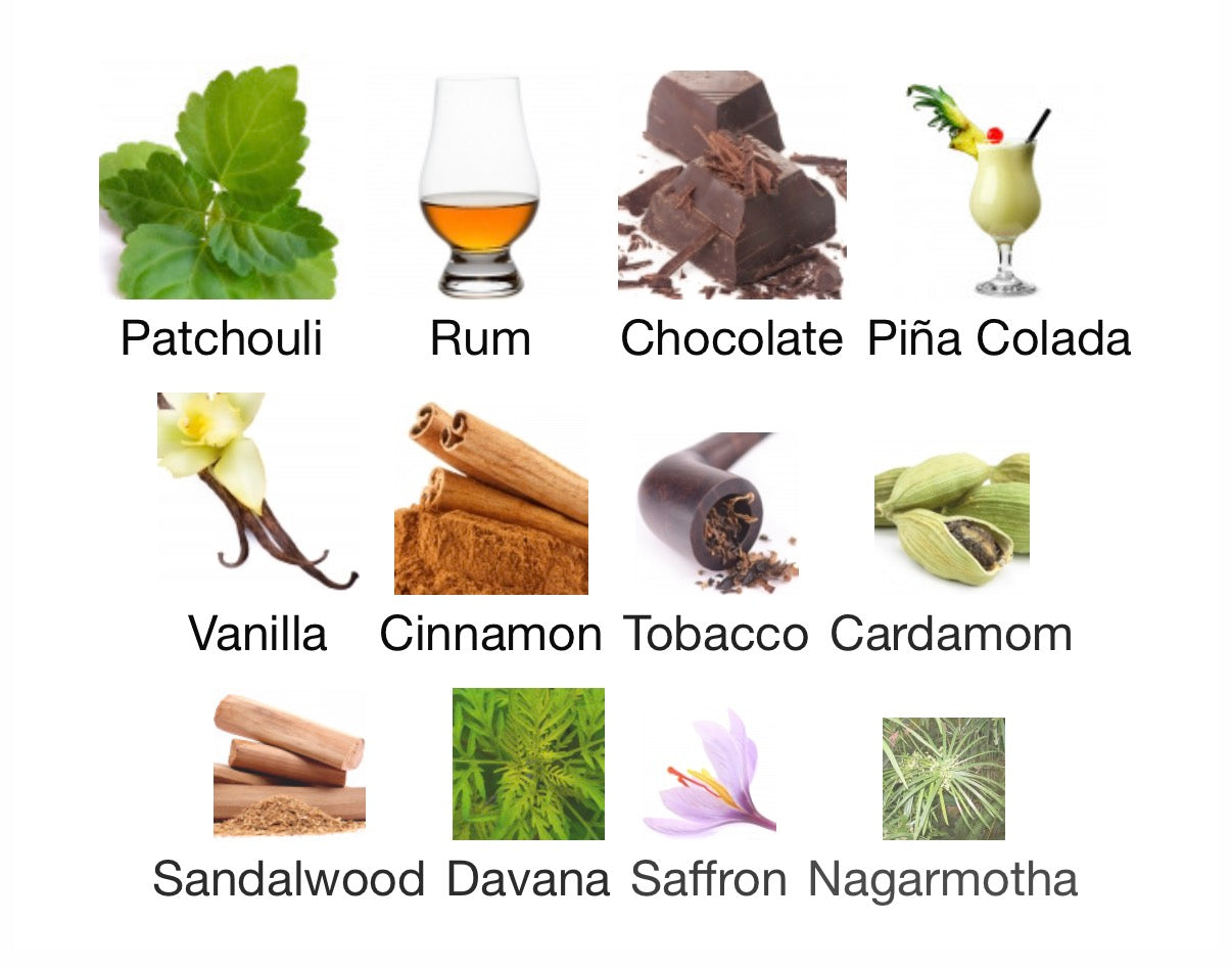 Base: Rhum, Vanilla Resin Absolute, Sandalwood, Patchouli, Tobacco