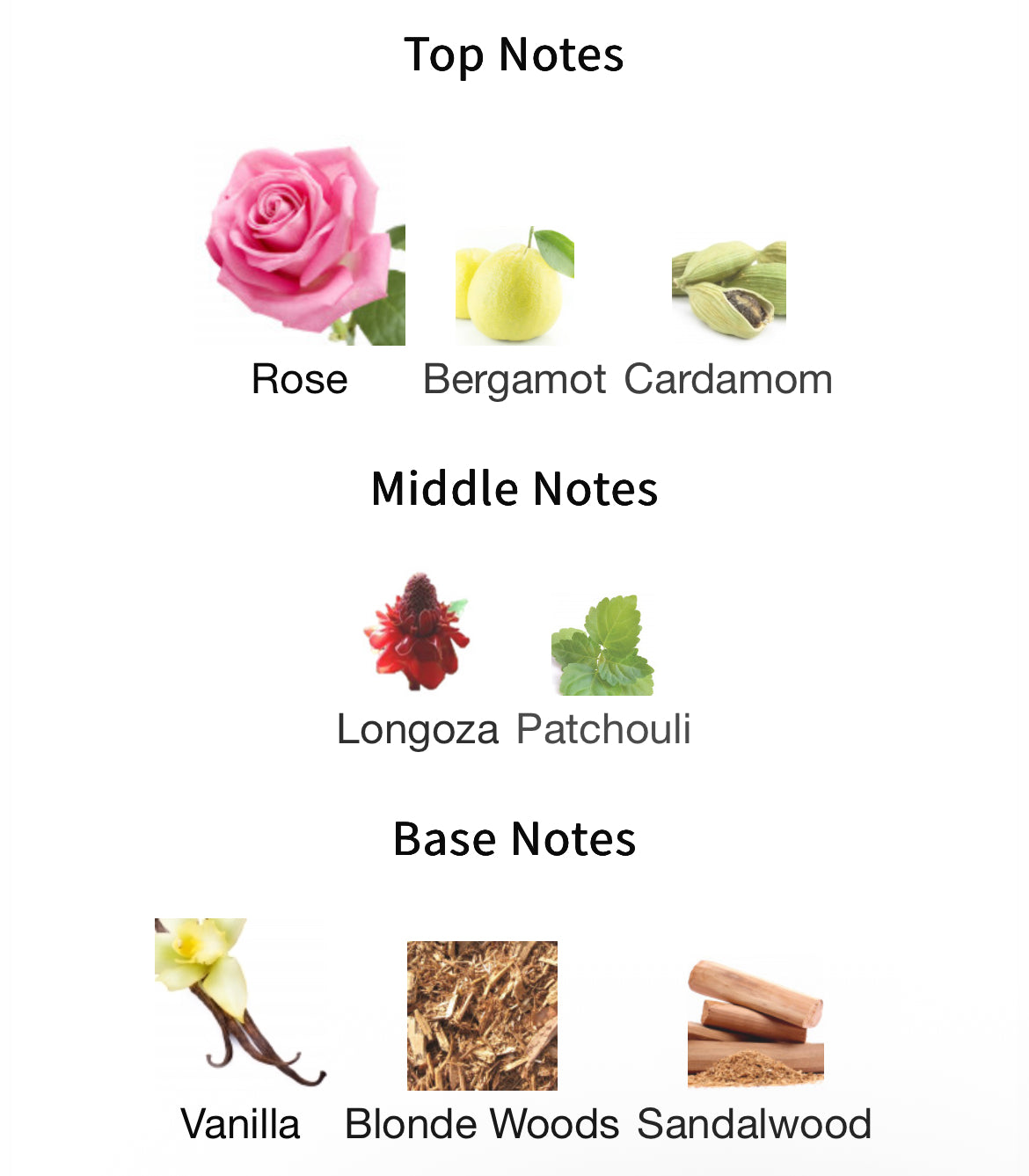 Middle: Patchouli, Creamy Caffe Latte, Longoza Flower